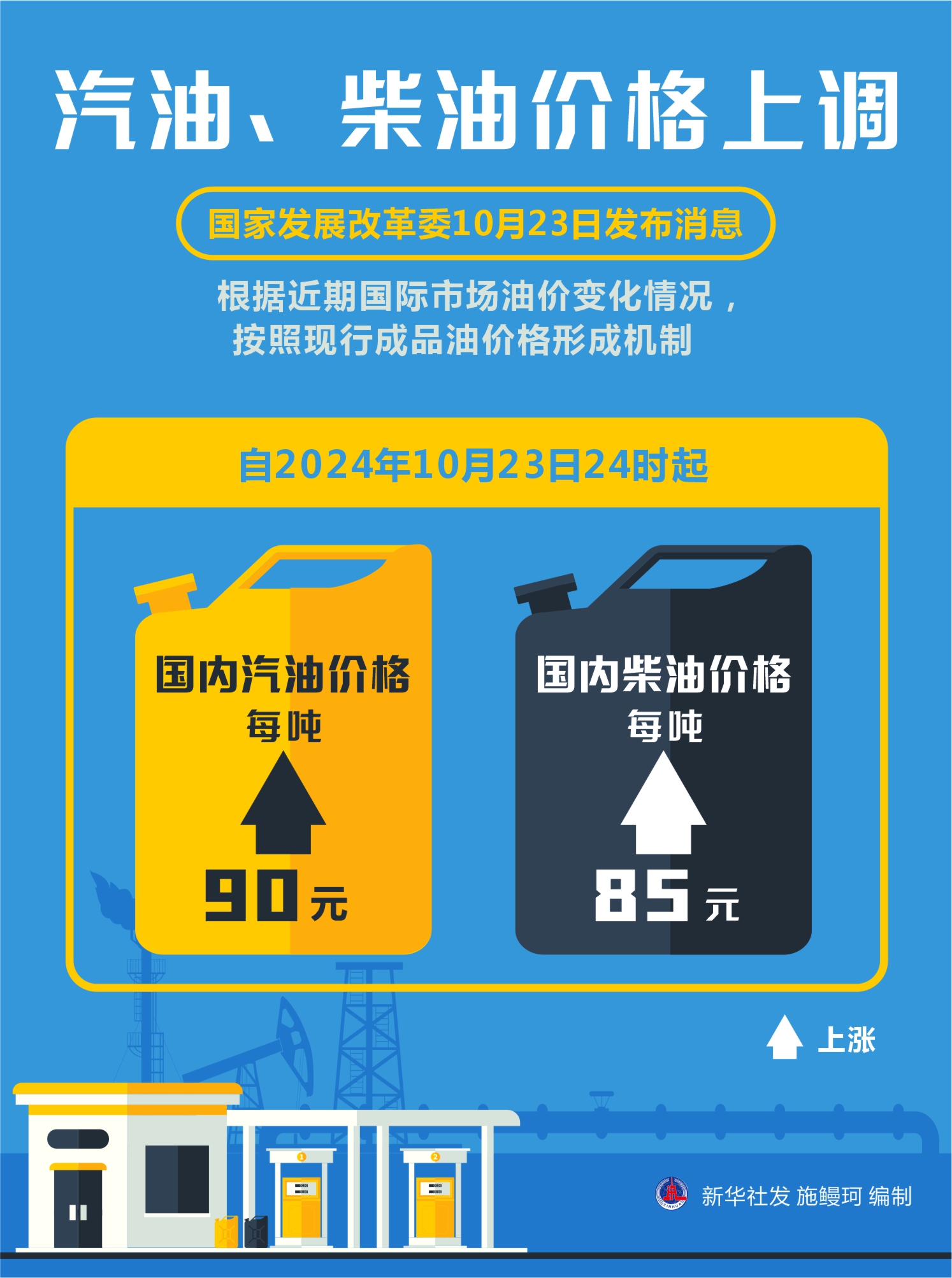 國家發(fā)展改革委23日發(fā)布消息,根據(jù)近期國際市場油價變化情況,按照現(xiàn)行成品油價格形成機制,自2024年10月23日24時起,國內汽、柴油價格每噸分別上漲90元和85元。