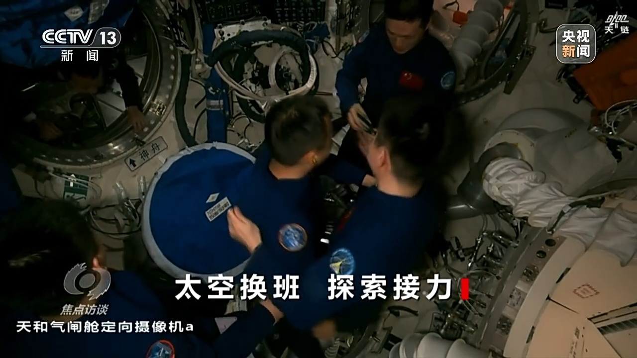 重返中國空間站的神十九航天員蔡旭哲打開艙門,再次體驗失重,他輕松地就從飛船進入空間站節(jié)點艙,和等待他們到來的神十八乘組來了一個大擁抱。第一次進入空間站的兩位“90后”航天員也同樣受到了熱烈的歡迎。在打掃一新的空間站核心艙,歡迎儀式必不可少。
