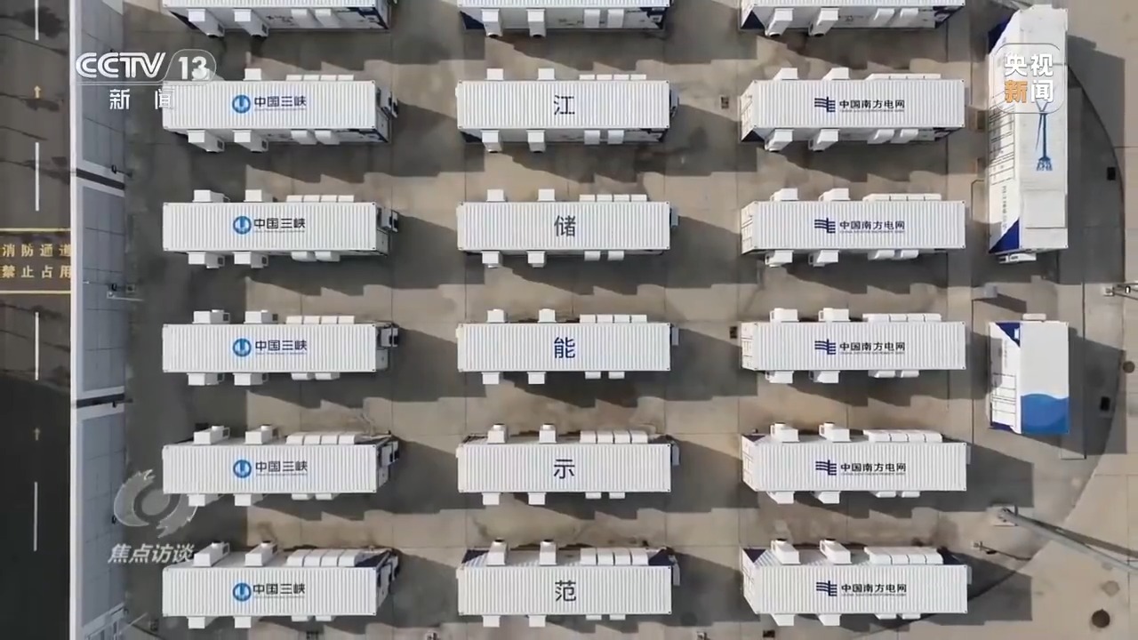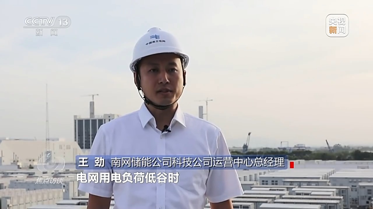 南網(wǎng)儲(chǔ)能公司科技公司運(yùn)營(yíng)中心總經(jīng)理 王勁:電網(wǎng)用電負(fù)荷低谷時(shí),把電廠發(fā)出的多余的電儲(chǔ)存到250個(gè)電池儲(chǔ)能柜內(nèi),用電高峰時(shí),把電池儲(chǔ)能柜里的電能釋放出來(lái)支持電網(wǎng)的電力供應(yīng)。