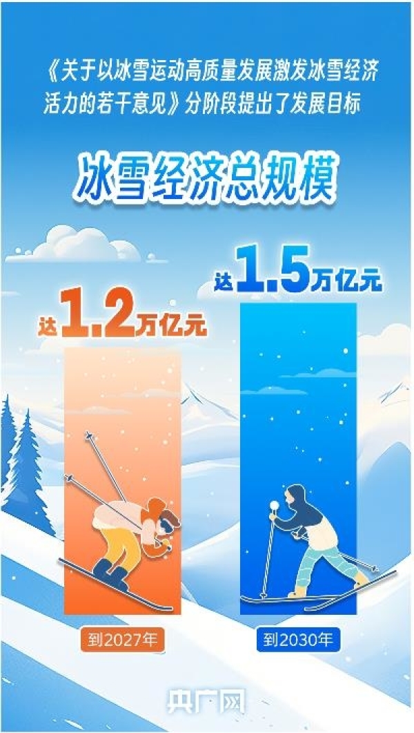 近日,國(guó)務(wù)院辦公廳公開發(fā)布《關(guān)于以冰雪運(yùn)動(dòng)高質(zhì)量發(fā)展激發(fā)冰雪經(jīng)濟(jì)活力的若干意見》(以下簡(jiǎn)稱《意見》),分階段提出發(fā)展目標(biāo):到2027年,冰雪運(yùn)動(dòng)場(chǎng)地設(shè)施更加完善,服務(wù)水平顯著提升,冰雪運(yùn)動(dòng)更加廣泛開展,冰雪經(jīng)濟(jì)總規(guī)模達(dá)1.2萬億元。到2030年,冰雪經(jīng)濟(jì)主要產(chǎn)業(yè)鏈條實(shí)現(xiàn)高水平協(xié)調(diào)融合發(fā)展,冰雪消費(fèi)成為擴(kuò)大內(nèi)需的重要增長(zhǎng)點(diǎn),冰雪經(jīng)濟(jì)總規(guī)模達(dá)1.5萬億元。