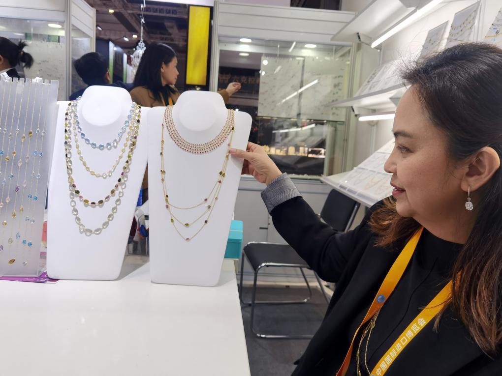 得益于共建“一帶一路”倡議和中國-東盟自由貿易協(xié)定的深化落實,阿拉尼婭一家的珠寶企業(yè)有了進軍中國廣袤市場的新計劃。這次她和家人帶來的珠寶飾品多達上百種款式,有鑲嵌紅寶石、祖母綠、碧璽等的項鏈、手鏈、戒指、吊墜等,吸引采購方駐足。