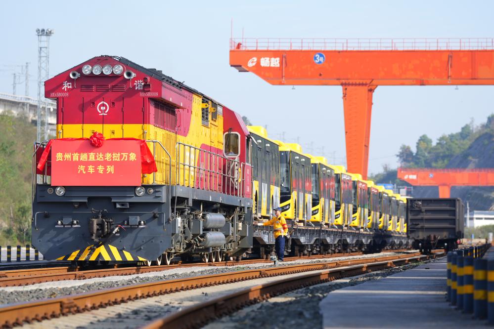 10月底,55臺“貴州造”新能源客車搭乘西部陸海新通道國際鐵路聯(lián)運(yùn)班列,從貴陽國際陸港都拉營站開出,不久后抵達(dá)老撾萬象。