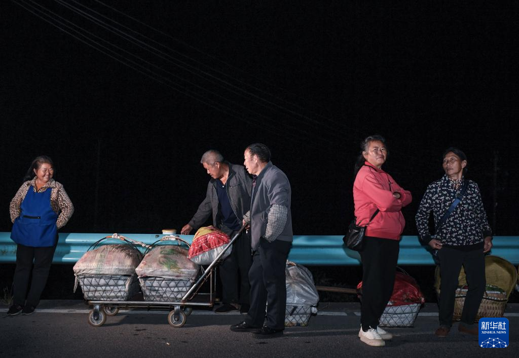 村民在貴陽市烏當區(qū)水田鎮(zhèn)定扒村候車,準備乘坐252路“惠農(nóng)專線”公交車進城賣菜(11月7日攝)。