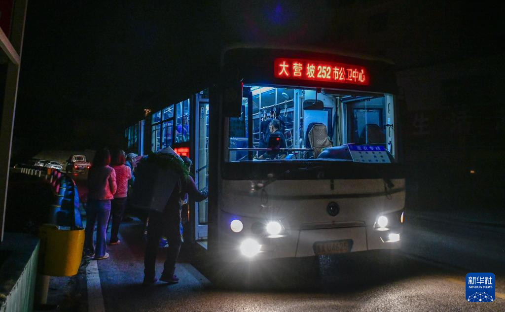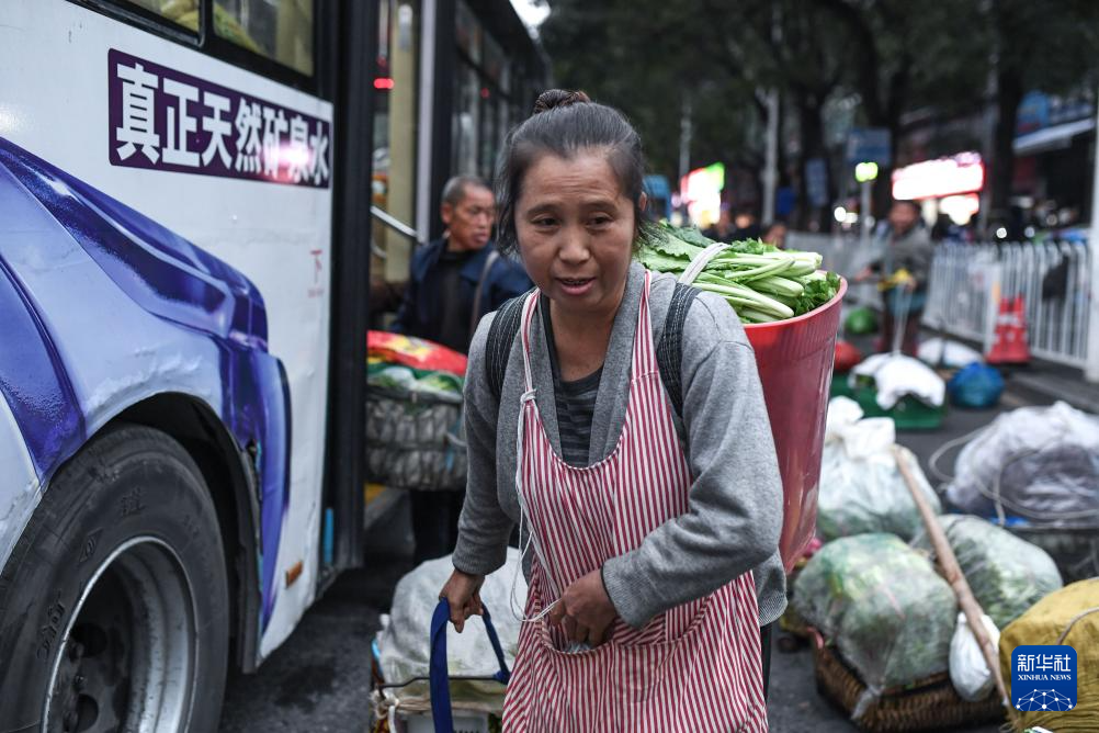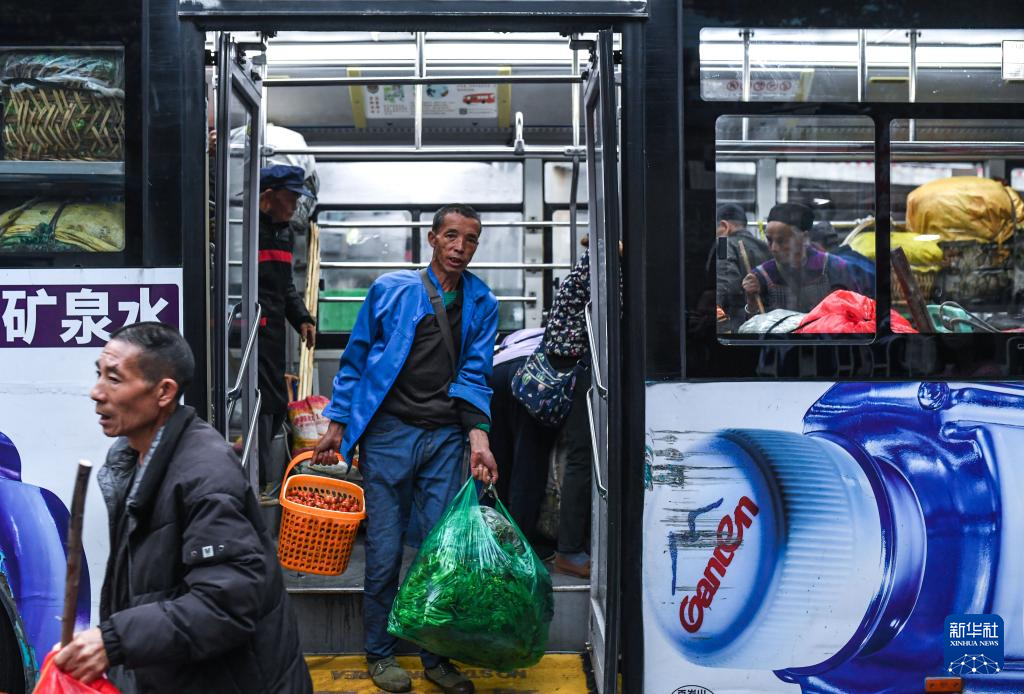 在貴陽市烏當區(qū)水田鎮(zhèn)定扒村,菜農(nóng)登上252路“惠農(nóng)專線”公交車,準備進城賣菜(11月7日攝)。