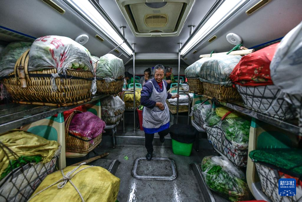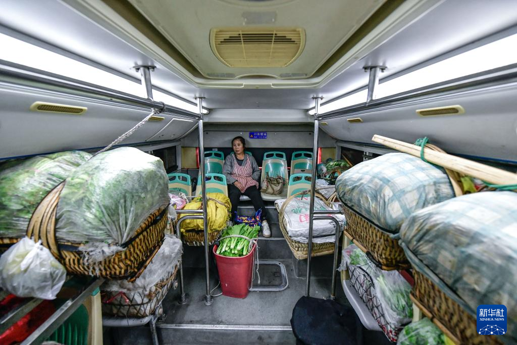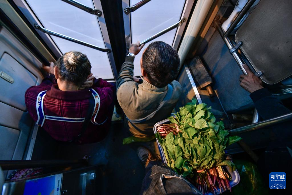 在貴陽市烏當區(qū)水田鎮(zhèn)定扒村,菜農(nóng)乘坐252路“惠農(nóng)專線”公交車,準備進城賣菜(11月7日攝)。