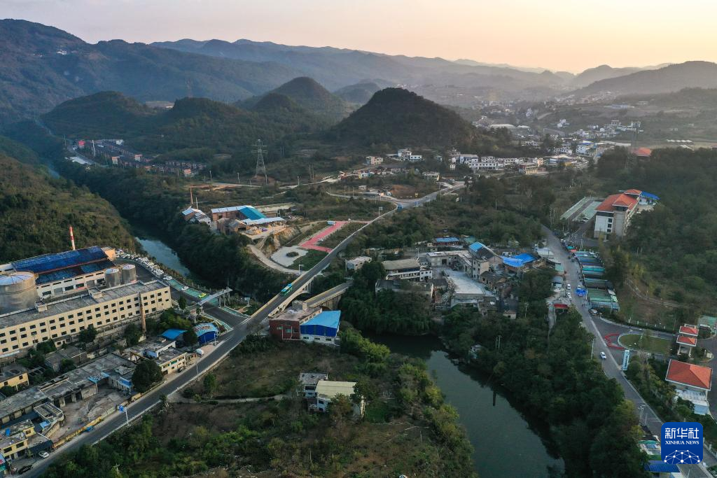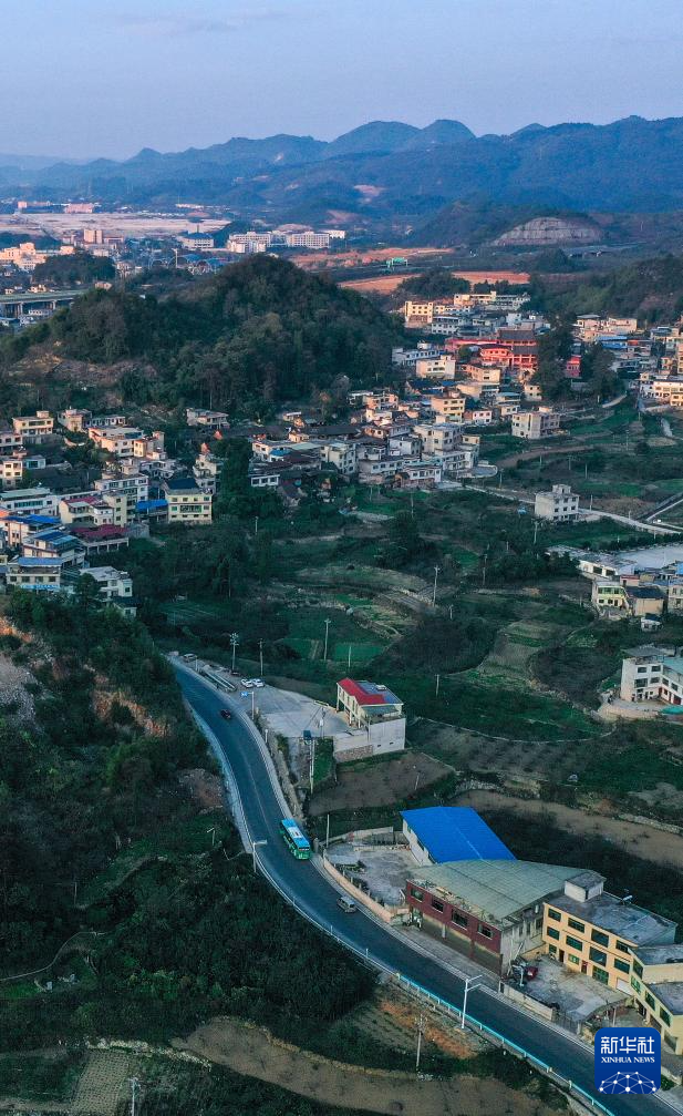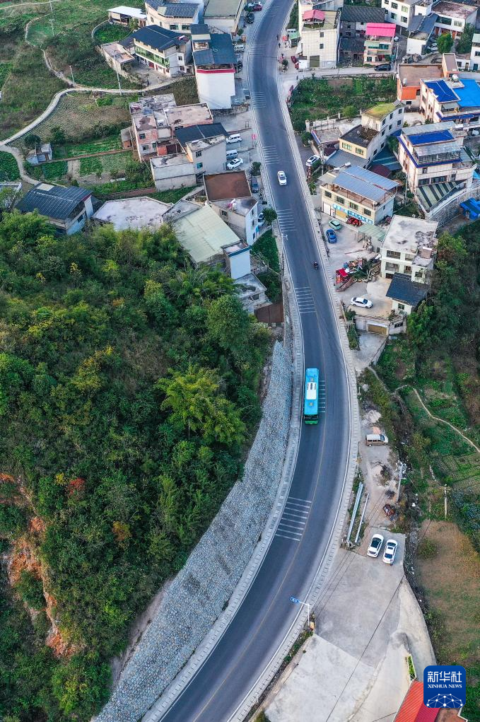 11月10日,252路公交車行駛在貴陽市烏當區(qū)水田鎮(zhèn)境內(nèi)(無人機照片)。