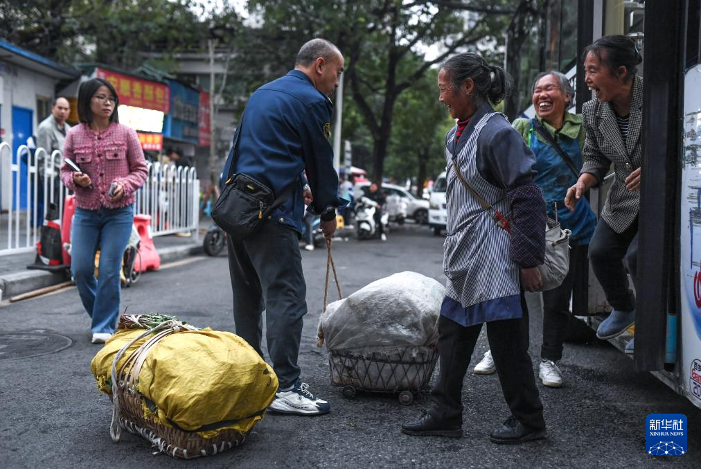 菜農(nóng)乘坐252路“惠農(nóng)專線”公交車抵達貴陽市大營坡終點站下車時與搭手幫忙的駕駛員交談(11月7日攝)。