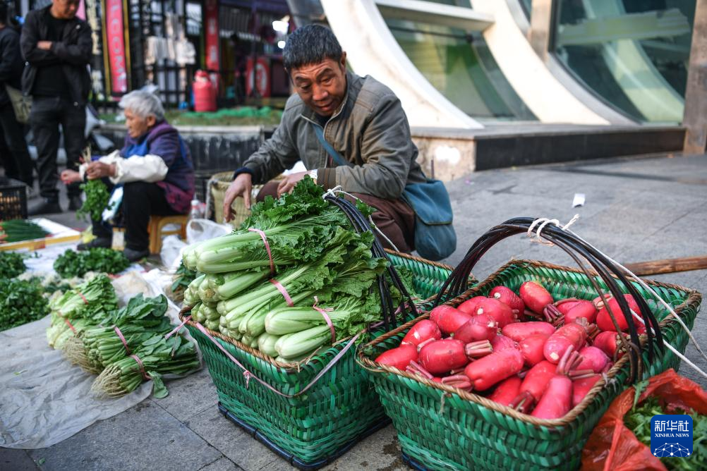 乘坐252路“惠農(nóng)專線”公交車進城的菜農(nóng)在貴陽市大營坡附近賣菜(11月7日攝)。