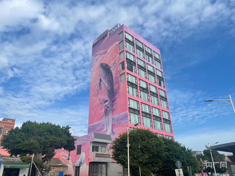 紅海灣開發(fā)區(qū)遮浪街道水龜寮村海濱街建筑外立面的“夢境鯨山”畫作(央廣網(wǎng)見習(xí)記者 張順鵬 攝)