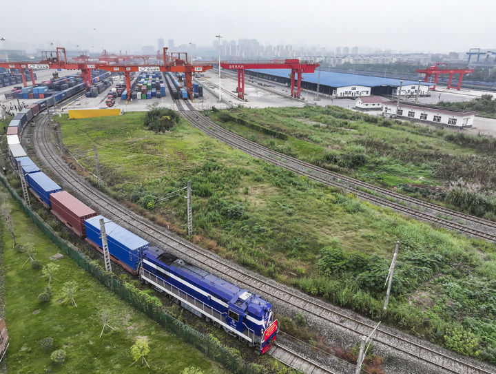 2024年11月15日,第10萬(wàn)列中歐班列——X8083次中歐班列(重慶—杜伊斯堡)從重慶團(tuán)結(jié)村中心站開(kāi)出(無(wú)人機(jī)照片)。新華社記者 王全超 攝