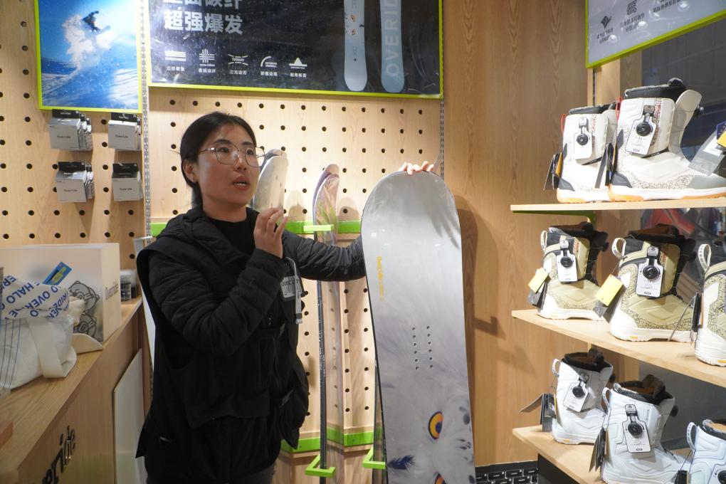 位于吉林省北大湖滑雪度假區(qū)的國(guó)產(chǎn)滑雪裝備品牌Overide門(mén)店內(nèi),店長(zhǎng)賈曉娜在介紹滑雪板性能。新華社記者孫逸軒 攝
