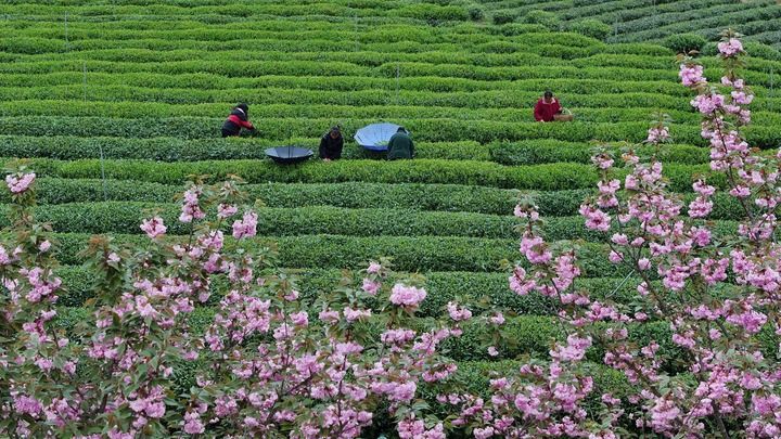 2024年4月6日,村民在貴州省遵義市鳳岡縣永安鎮(zhèn)田壩社區(qū)茶葉基地采摘春茶(無人機(jī)照片)。新華社發(fā)(王超 攝)