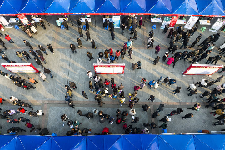 2023年1月31日,在四川省閬中市人民廣場,求職者參加?xùn)|西部勞務(wù)協(xié)作暨春風(fēng)行動大型招聘會(無人機(jī)照片)。新華社發(fā)(王玉貴 攝)
