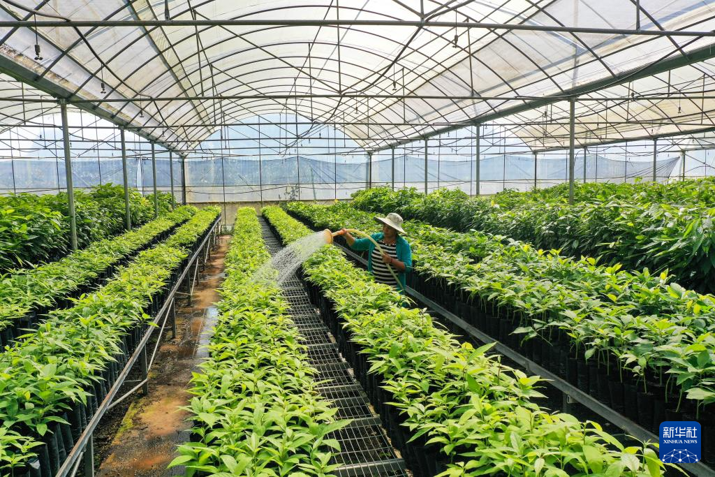 一名工作人員在普洱綠銀生物股份有限公司的牛油果種苗基地給牛油果種苗澆水(10月28日攝,無人機照片)。新華社記者 陳欣波 攝