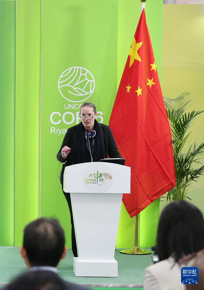12月4日,在沙特阿拉伯利雅得,世界銀行全球環(huán)境局局長瓦萊麗·?;凇堵?lián)合國防治荒漠化公約》第十六次締約方大會(huì)(COP16)中國館舉辦的邊會(huì)上發(fā)言。新華社記者 王東震 攝