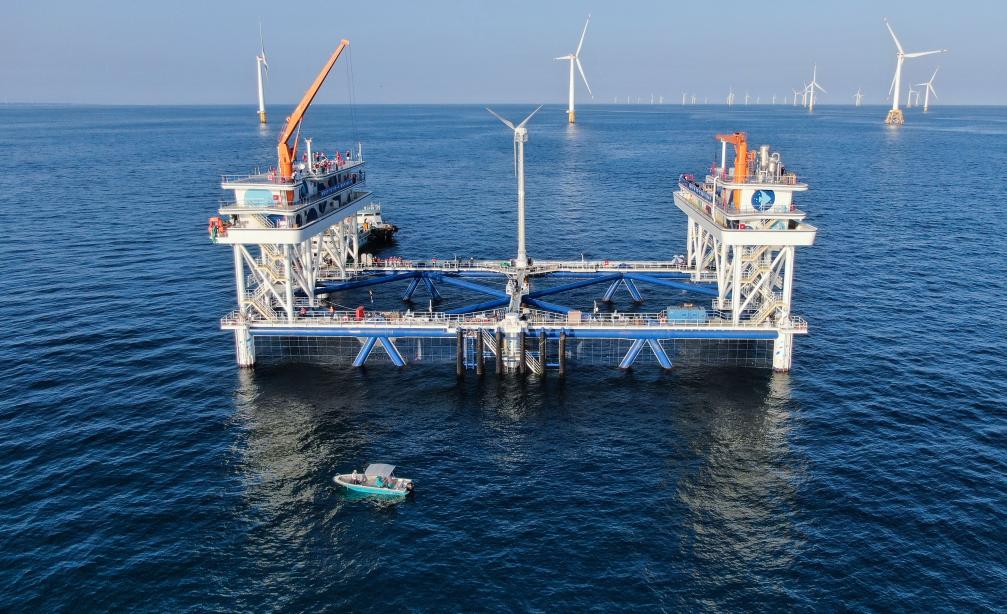 這是中廣核“伏羲一號”風(fēng)漁融合網(wǎng)箱平臺(無人機(jī)照片)。新華社記者鄧華 攝