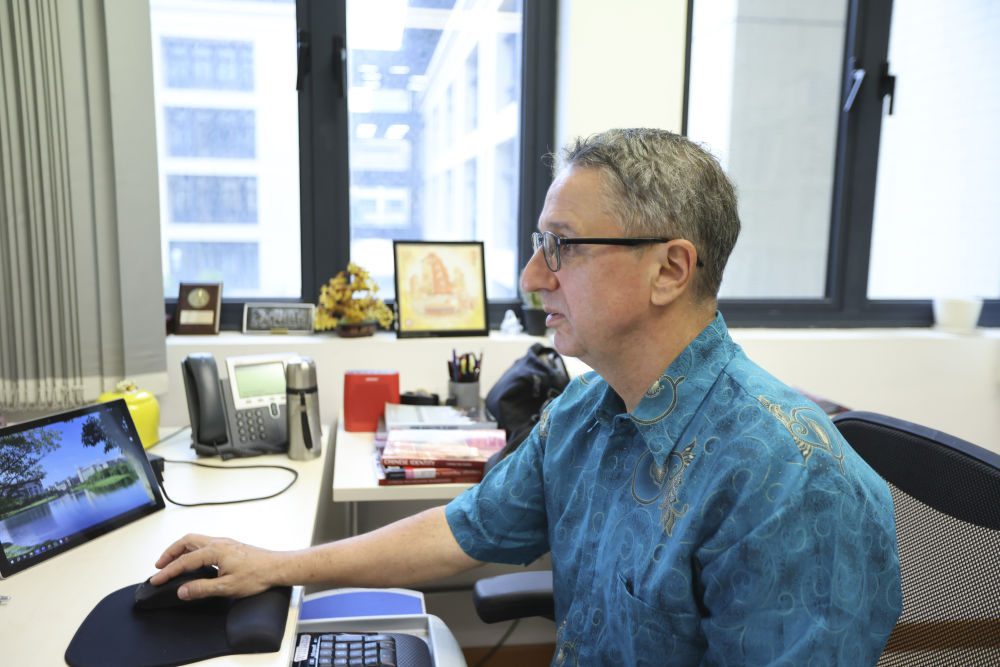 2024年11月14日,澳門大學(xué)社會(huì)科學(xué)學(xué)院副教授、來自美國的托德·萊爾·桑德爾(中文名申大德)在辦公室工作。新華社記者 梁家駿 攝