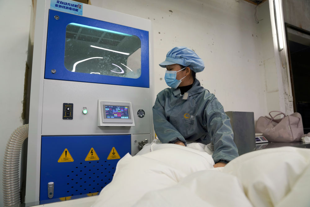 在橋圩鎮(zhèn)一家羽絨制品生產(chǎn)車間內,工人使用全自動充絨機制作羽絨被。新華社記者 楊馳 攝