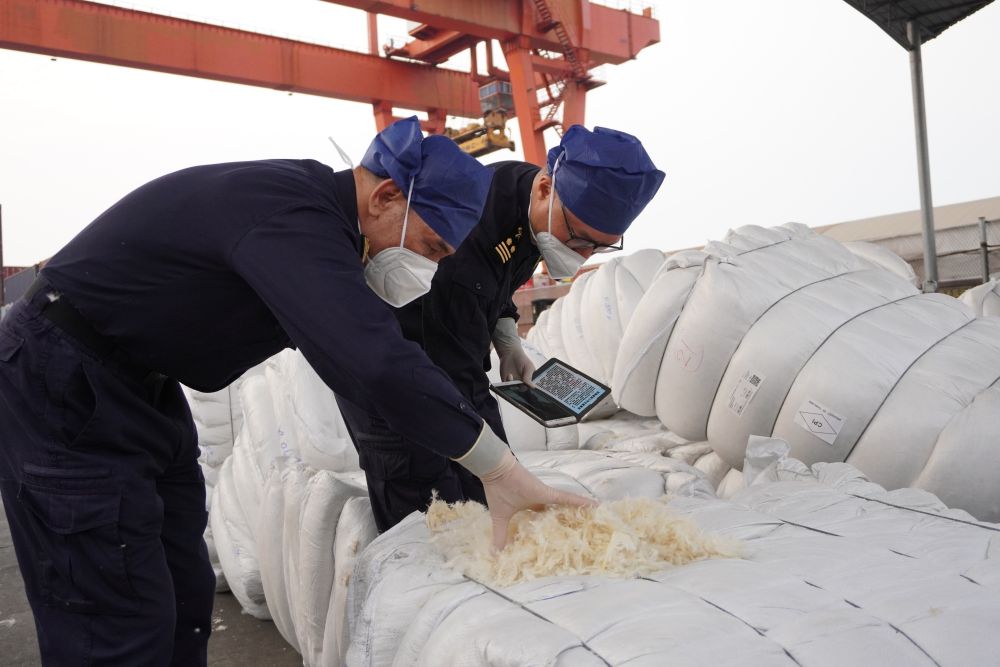 海關工作人員正在對水洗羽毛羽絨進行檢查。新華社發(fā)