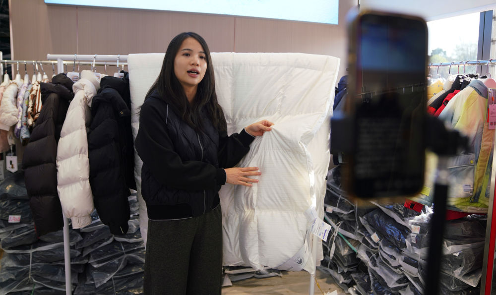 在橋圩羽絨產(chǎn)業(yè)園展示廳,銷售人員正在直播介紹當?shù)厣a(chǎn)的羽絨被。新華社記者 楊馳 攝