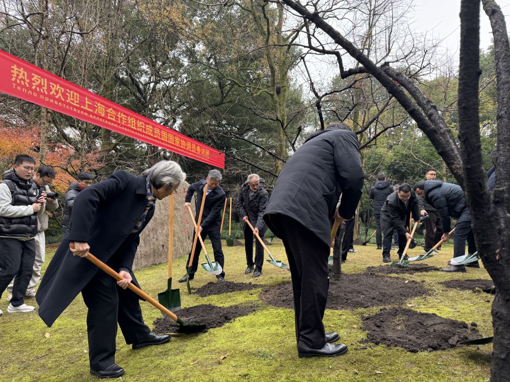 12月13日,上海合作組織成員國(guó)國(guó)家協(xié)調(diào)員來(lái)到西湖邊的“上合友誼林”,共同為象征友誼的美人梅培土。新華社記者 段菁菁 攝