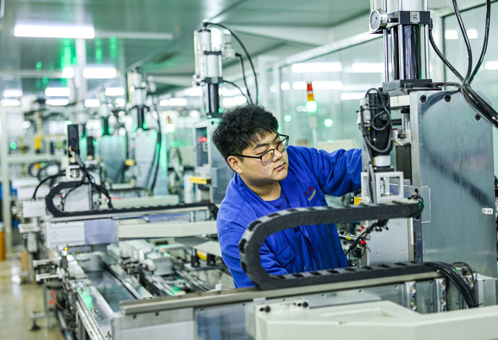 2024年12月12日,在山東省榮成市一家燃?xì)庥?jì)量?jī)x表制造企業(yè)的智能化生產(chǎn)車(chē)間內(nèi),維修工人在進(jìn)行設(shè)備調(diào)試。新華社發(fā)(李信君攝)