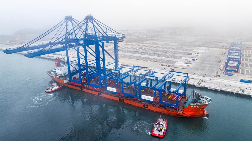 2024年6月27日,岸邊集裝箱起重機(jī)和軌道吊運(yùn)抵秘魯錢(qián)凱港。新華社發(fā)(上海振華重工供圖)