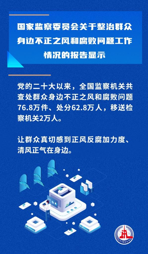 黨的二十大以來,全國監(jiān)察機關(guān)查處群眾身邊不正之風(fēng)和腐敗問題76.8萬件、處分62.8萬人,移送檢察機關(guān)2萬人……