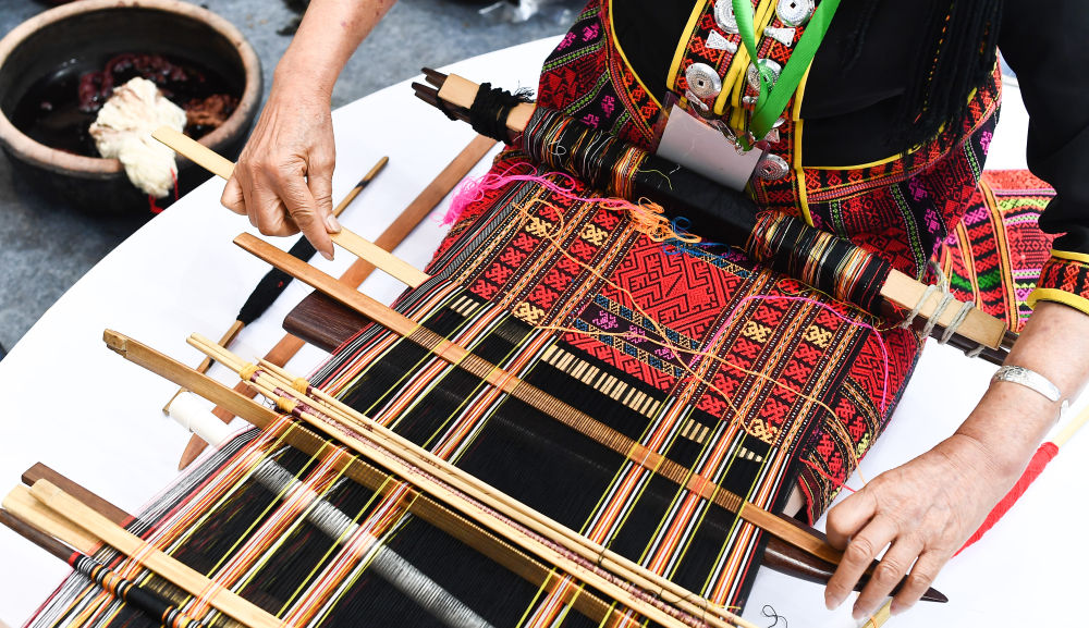 在2023海南錦繡世界文化周非物質(zhì)文化遺產(chǎn)傳統(tǒng)織繡印染技藝項(xiàng)目精品展上,手工藝人在編織黎錦(2023年4月30日攝)。新華社記者 楊冠宇 攝