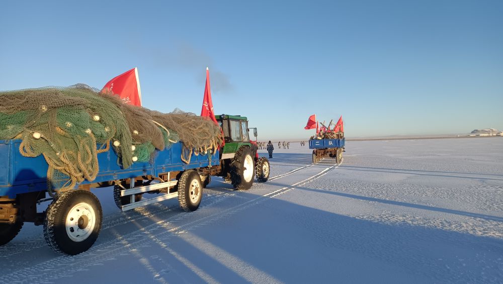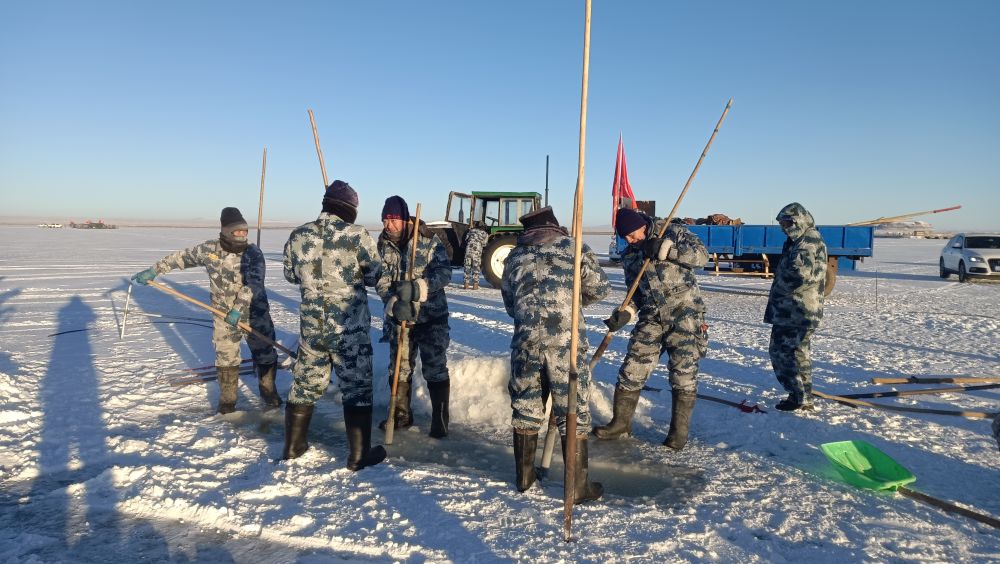 遼闊的達里湖銀裝素裹,在零下二十攝氏度左右的嚴寒中,漁業(yè)工人們開始了一系列精細而有序的冬捕作業(yè)準備工作。