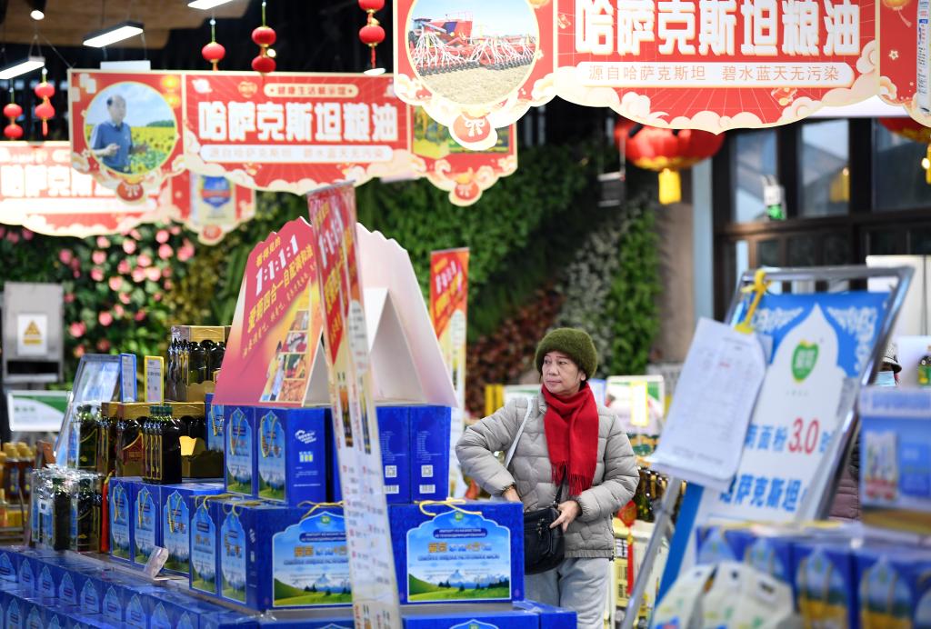消費者在“中歐班列(西安)進口商品年貨節(jié)”上挑選哈薩克斯坦糧油產品(2024年2月1日攝)。 新華社記者 李一博 攝