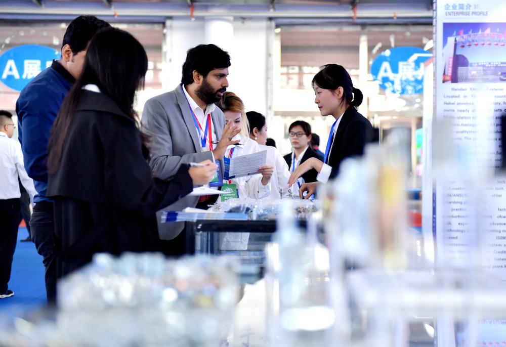 2024年10月10日,采購商(中)在2024年中國·永年緊固件基地國際采購大會現(xiàn)場了解緊固件產品信息。新華社記者 王曉 攝