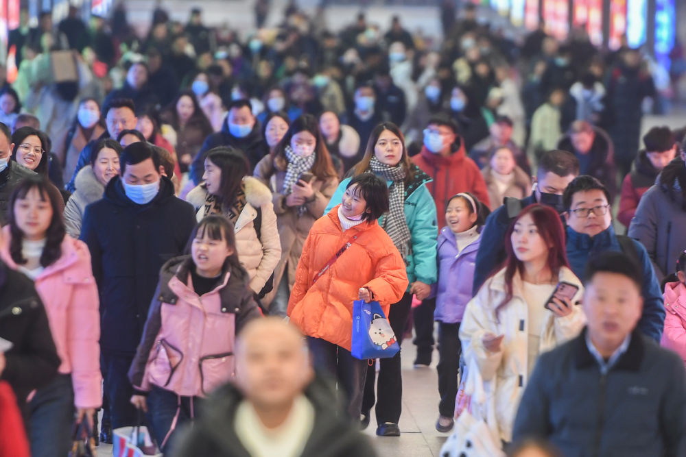2月5日,在廣西柳州站出站口,一名接站者與剛出站的女朋友碰頭互動。