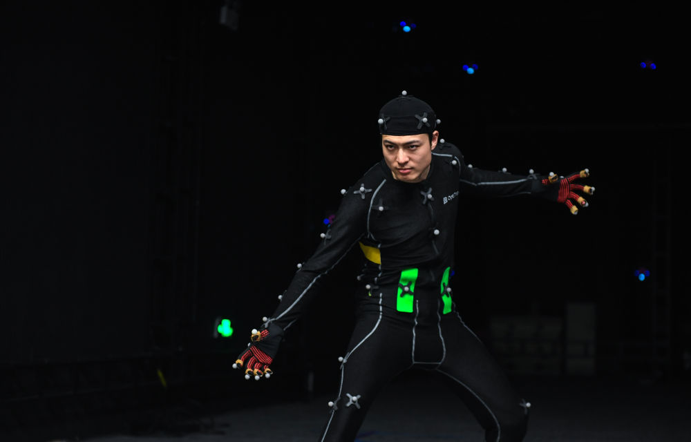 8月28日,在深圳的一個動捕基地,殷凱在演出中利用肢體動作展現(xiàn)游戲角色特點。