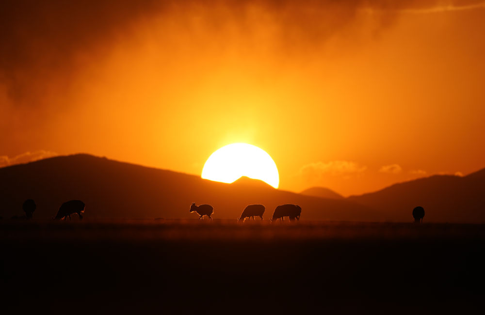 這是2024年6月16日拍攝的晚霞中魯確塘草原上待產(chǎn)的國家一級保護動物藏羚羊。