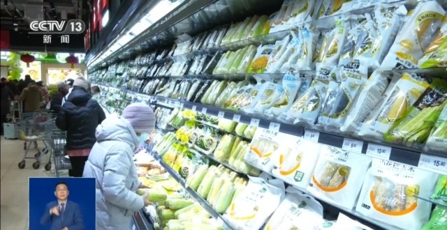 記者在北京一家生鮮超市里看到,新年主題的裝飾品擺放在顯著位置,年貨禮盒琳瑯滿目。新鮮到店的蔬菜、鮮果、肉類等商品排滿了貨架,吸引了大批顧客選購。