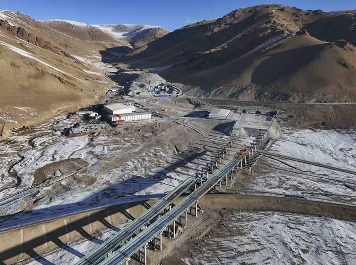 這是12月25日在新疆和靜縣拍攝的天山勝利隧道出口及附近在建公路(無(wú)人機(jī)照片)。新華社記者 胡虎虎 攝