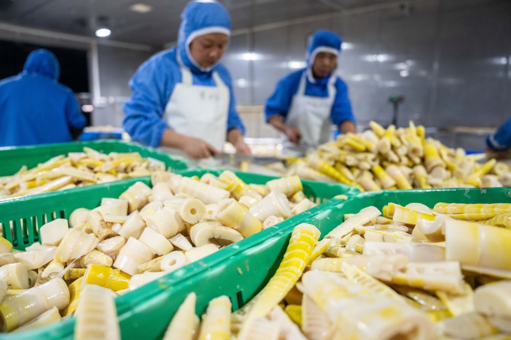 2024年11月27日,工人在湖南省益陽(yáng)市桃江縣馬跡塘鎮(zhèn)筍竹特色產(chǎn)業(yè)園內(nèi)一家鮮筍加工企業(yè)生產(chǎn)車(chē)間加工鮮筍。竹筍產(chǎn)業(yè)是桃江縣的傳統(tǒng)特色產(chǎn)業(yè),當(dāng)?shù)匾劳胸S富的竹林資源,積極發(fā)展竹筍深加工產(chǎn)業(yè)。新華社記者 陳思汗 攝