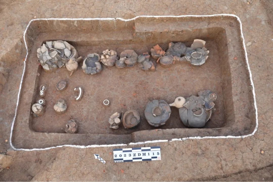 2023年以來,省文物考古研究院圍繞明晰遺址內部布局和確認遺址宏觀結構兩個方面,再次開展對東山村遺址的主動性考古發(fā)掘。截至目前,共發(fā)掘新石器時代大型紅燒土堆積4處、墓葬17座、房址1座、灰坑20座、灰溝1條、水井1口、柱洞3個。
