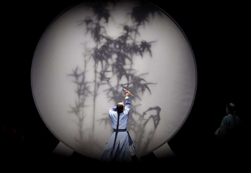 舞臺上,古琴與琵琶的悠揚(yáng)旋律仿若一陣清風(fēng),輕輕拂開歷史的畫卷,清代揚(yáng)州的風(fēng)情萬種如詩如畫般徐徐展開。鄭板橋筆下的竹、蘭、石化作他性格的三種特質(zhì),生動(dòng)地展現(xiàn)了為官之德、書生之質(zhì)、為民之心,以及他對生命價(jià)值的執(zhí)著堅(jiān)守,深深地震撼著每一位觀者的心靈,讓他們沉浸其中,心潮澎湃。