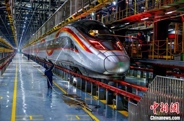 圖為修理庫中,工作人員清洗動車?!垥?攝