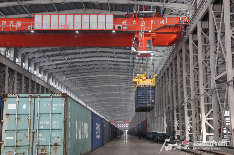 “轟隆轟隆……”室內(nèi),一列列裝滿貨物的列車,從阿拉山口站集裝箱換裝庫(kù)有序地駛進(jìn)又駛出。