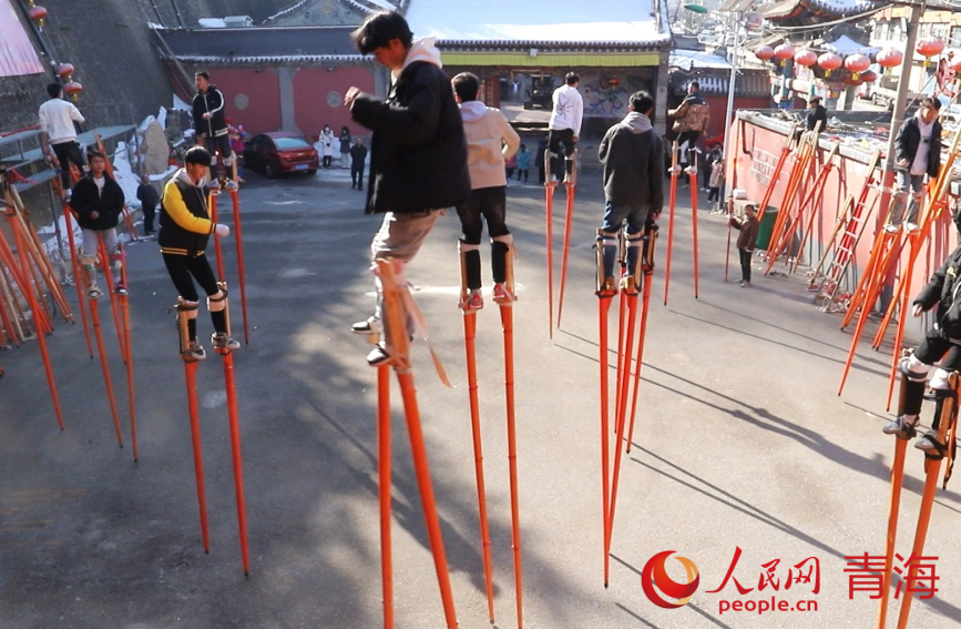 綁蹺、試蹺、定蹺……青海省西寧市湟中區(qū)魯沙爾鎮(zhèn)火神廟,魯沙爾高蹺隊(duì)迎來(lái)了春節(jié)前最后一次排練?!皬呐D月初一到現(xiàn)在二十多天了,今年大家積極性很高,報(bào)名的人也多,排練效果不錯(cuò)?!弊龊脺?zhǔn)備,隨著社火音樂(lè)的鼓點(diǎn)舞動(dòng)起來(lái),魯沙爾鎮(zhèn)高蹺協(xié)會(huì)會(huì)長(zhǎng)李玉龍站在臺(tái)階上看著排練隊(duì)形。