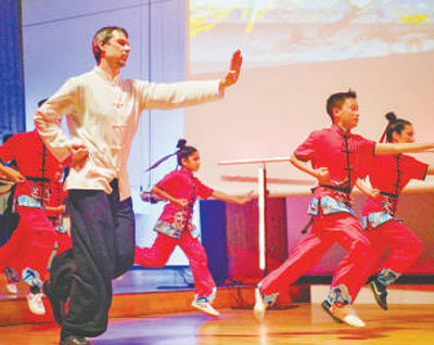在2025年柏林及勃蘭登堡中國留學生蛇年春節(jié)聯歡晚會上,當地學生表演武術節(jié)目《中國武魂》。記者 劉 赫攝
