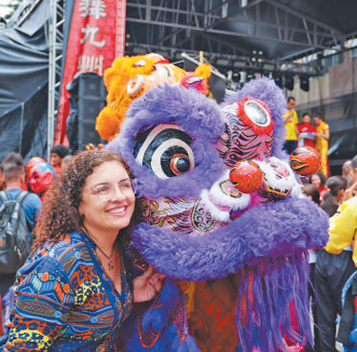 當地時間2月1日,在巴西圣保羅市中心自由廣場舉辦的歡樂春節(jié)園游會開幕式上,當地民眾與舞獅表演者合影。記者 時元皓攝