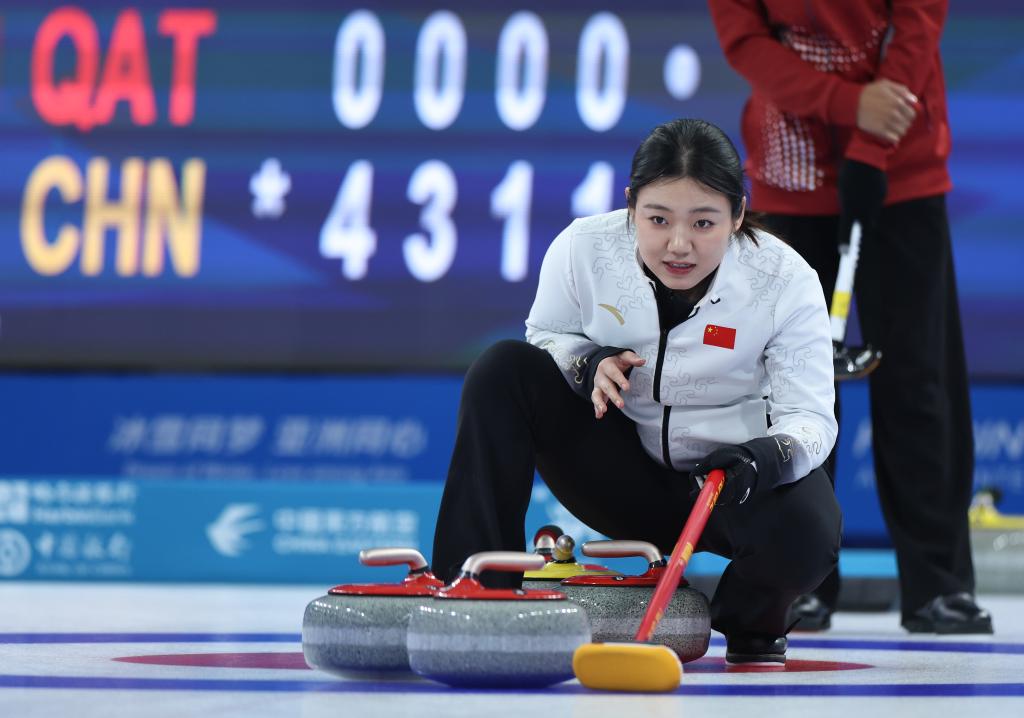 2月6日,中國隊選手韓雨在比賽中。當日,在哈爾濱舉行的第九屆亞冬會冰壺混雙循環(huán)賽B組第8輪比賽中,中國隊10比1戰(zhàn)勝卡塔爾隊。新華社記者 王楷焱 攝