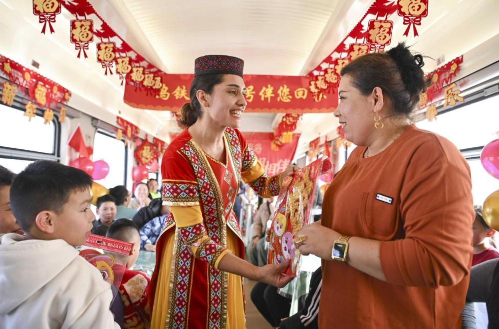 在喀什開往成都西的列車上,艾爾開牙·多力開(左)向參與“列車春晚”互動游戲的乘客贈送福字年畫(2025年1月17日攝)。