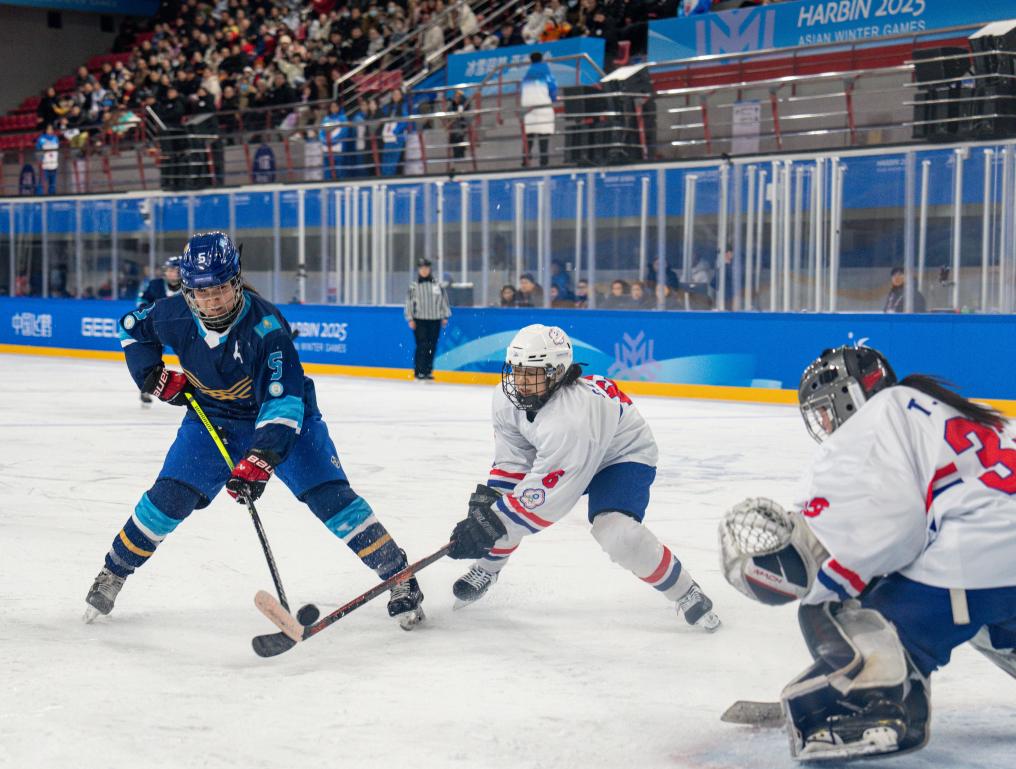 2月6日,在哈爾濱體育學(xué)院舉行的2025年第九屆亞冬會女子冰球小組賽B組比賽中,中國臺北隊1:5不敵哈薩克斯坦隊。新華社記者 孫非 攝
