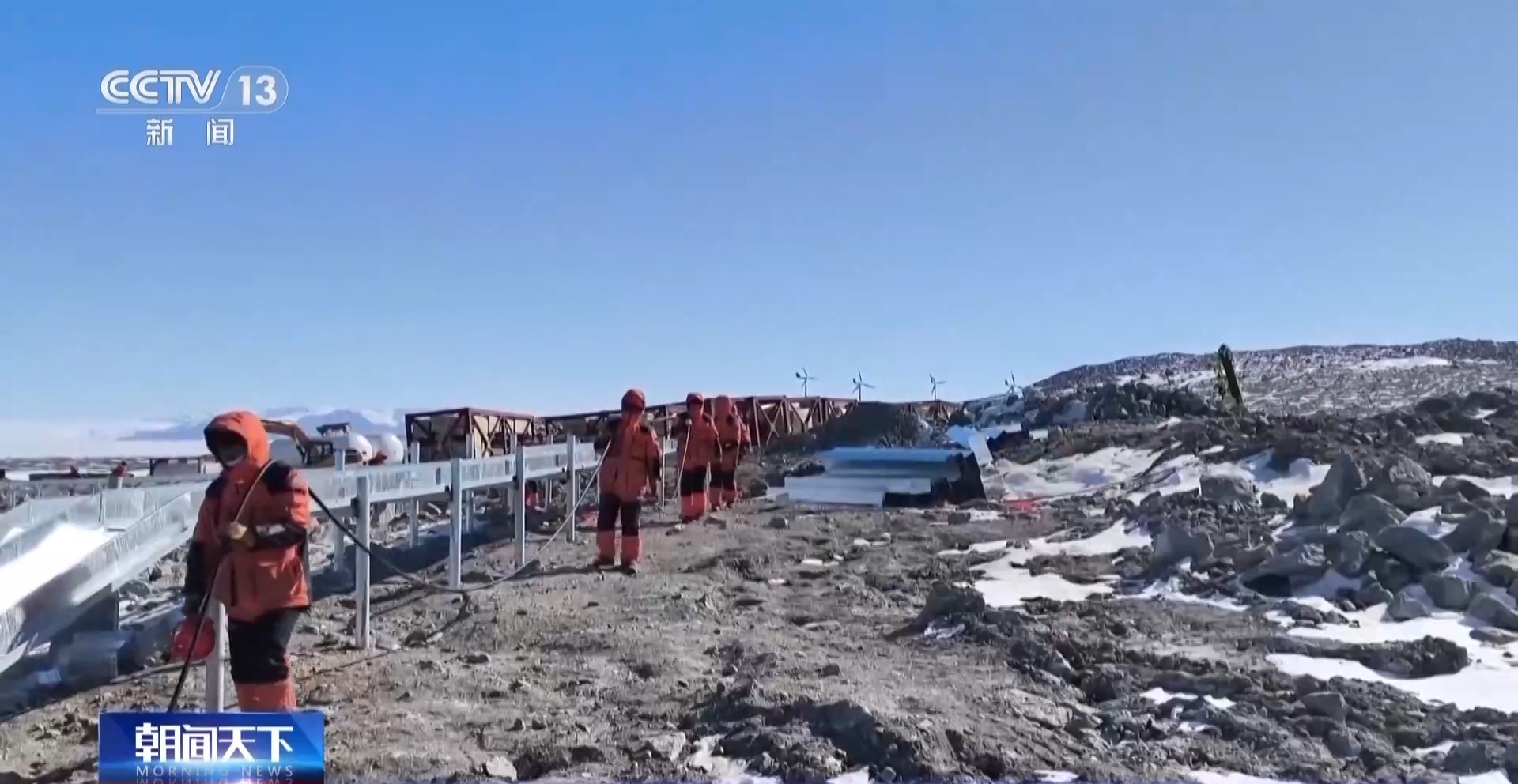 中國(guó)第41次南極考察隊(duì)秦嶺站站長(zhǎng) 王哲超:我身后就是秦嶺站新能源體系中的風(fēng)力發(fā)電和光伏發(fā)電。目前我們已經(jīng)完成了10個(gè)風(fēng)機(jī)的安裝,現(xiàn)在正在安裝的是光伏支架還有光伏板。