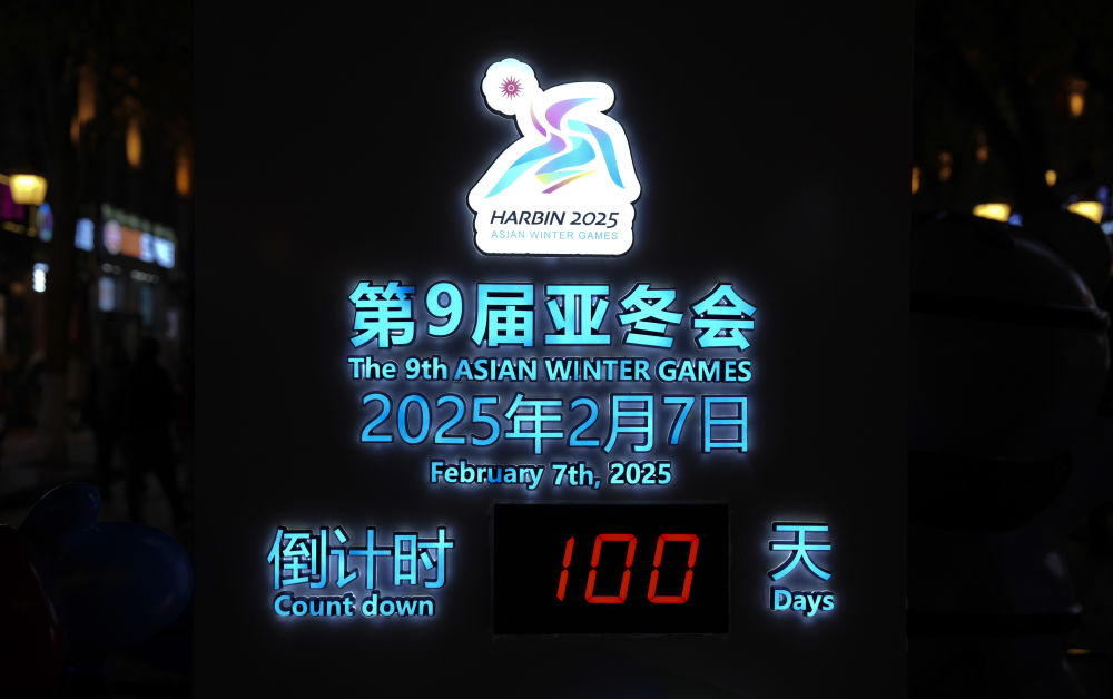 這是2024年10月30日在哈爾濱中央大街上拍攝的亞冬會倒計時牌。當(dāng)日是2025年第九屆亞洲冬季運動會倒計時100天。